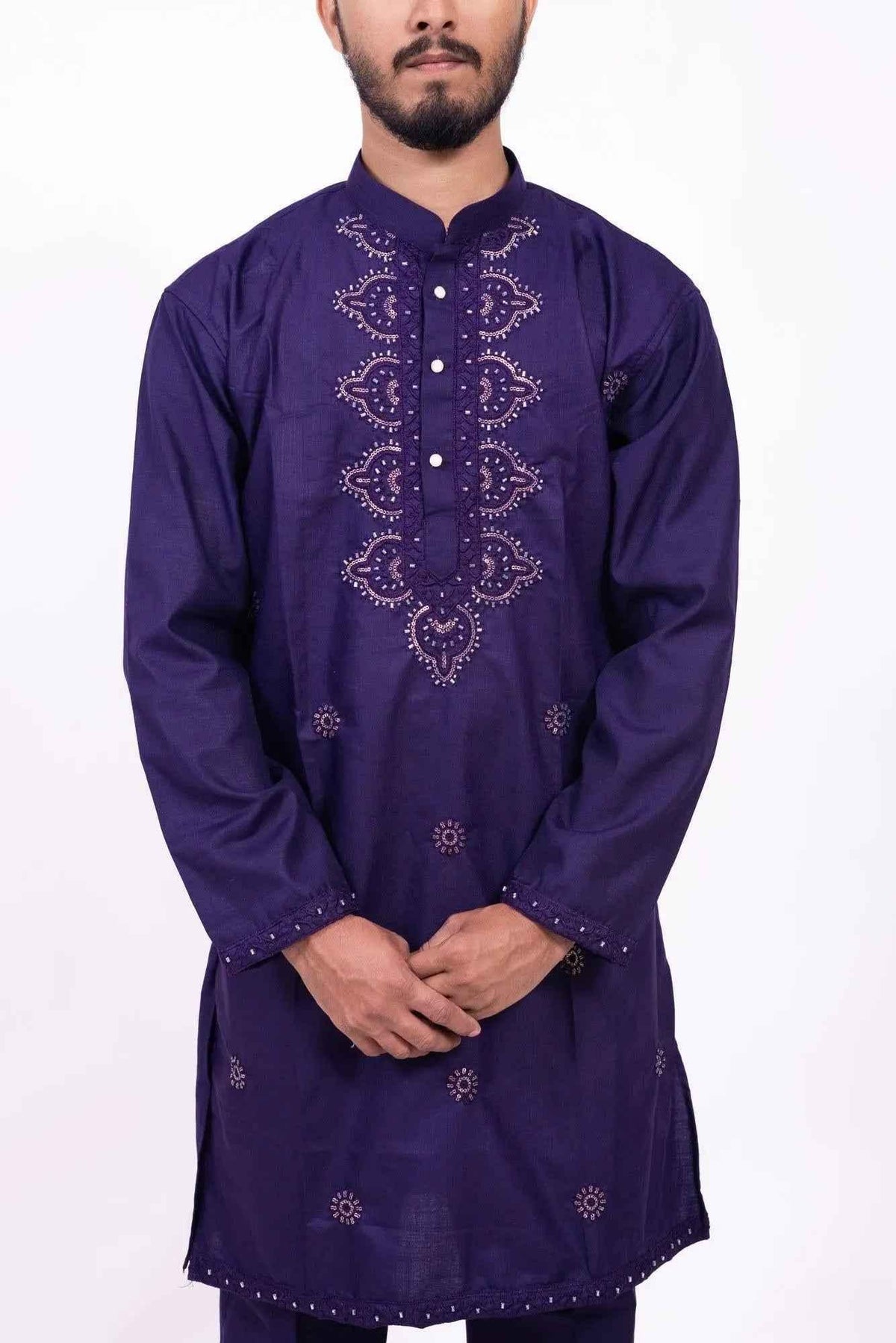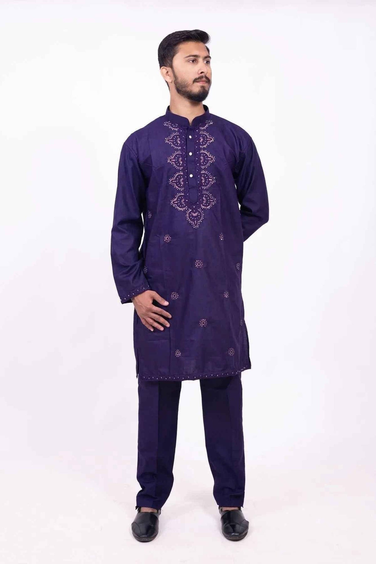 Add Royal elegance to your ethnic wardrobe with this beautifully crafted purple kurta pyjama set. The kurta features intricate traditional embroidery on the front panel and sleeves, giving it a rich and festive look. Made from comfortable, breathable fabric, this outfit is perfect for weddings, festive occasions, poojas, and cultural events. Pair it with traditional footwear for a complete regal appearance.