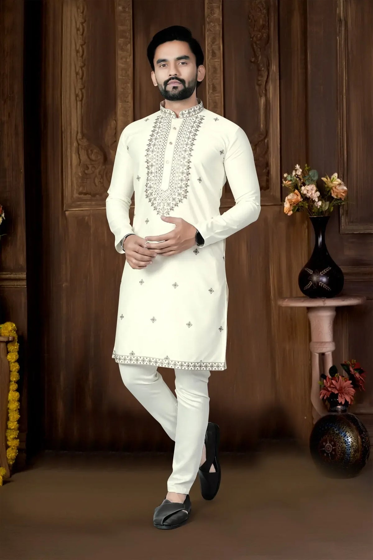 Off-White Designer Embroidered Kurta Pyjama for Festive Wear