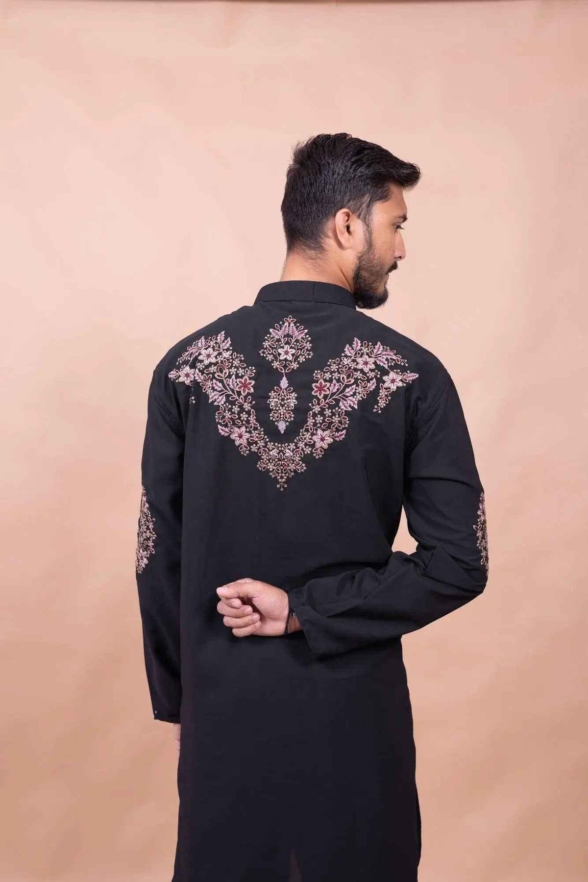Make a bold and elegant statement with this Premium Black Kurta Pyjama set, designed for men who prefer timeless sophistication. The kurta features rich floral embroidery in contrasting tones on the front panel, sleeves, hemline, and back, giving it a luxurious and royal appeal. Crafted from smooth, breathable fabric, this ensemble offers both comfort and style, making it ideal for weddings, receptions, festive occasions, and evening celebrations.